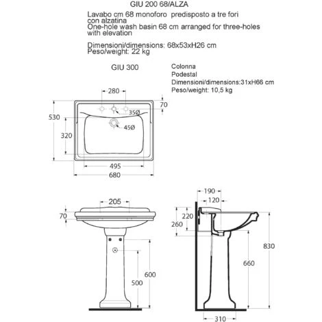 Azzurra – lavabo con alzatina 68 cm porcellana bianco – serie: giunone (senza colonna)