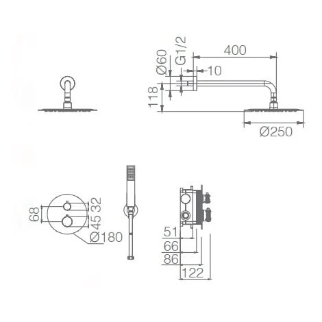 Dimensioni: Il rubinetto misura 18 cm di diametro. Il soffione ha un diametro di 25 cm e il suo braccio a parete è lungo 40 cm.
