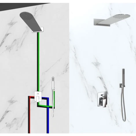L’impianto va predisposto installando il miscelatore da incasso fornito e predisponendo le uscite per il soffione e per il doccino. Il deviatore incluso nel miscelatore dà la possibilità di erogare l’acqua separatamente nel soffione o nel doccino a muro.