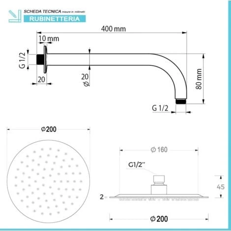 - Tipologia: braccio doccia tondo + soffione doccia tondo