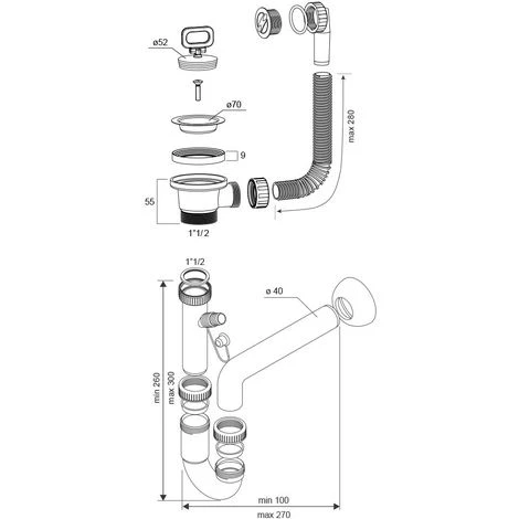 Kit di scarico universale per qualsiasi tipo di vasca lavatoio. Realizzato in materiale plastico viene fornito completo di sifone e piletta con troppopieno.