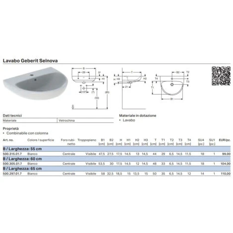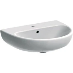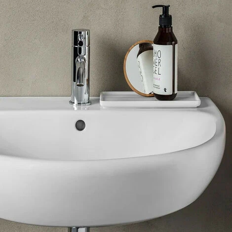 Lavabo da sospeso con foro troppopieno, in ceramica bianca e con foro per miscelatore e foro troppopieno.