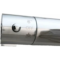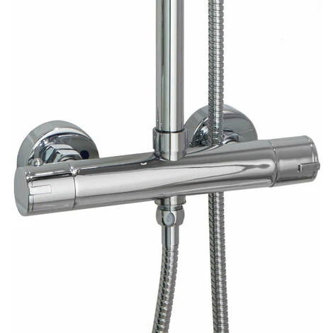 Miscelatore termostatico per colonna doccia Possiede un attacco da 1/2 per flessibile doccia e un attacco superiore da 3/4 da collegare alla colonna doccia Realizzato tutto in ottone cromato, viene fornito completo di eccentrici.