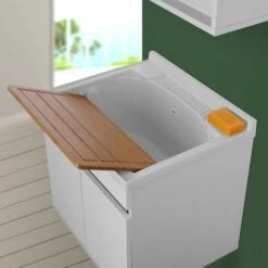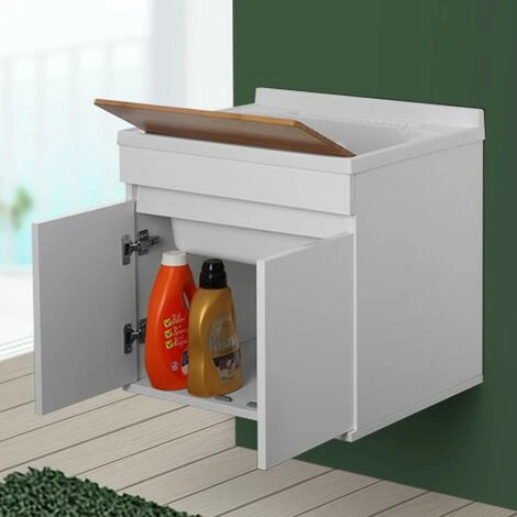 Mobile lavatoio sospeso – 60×50 cm bianco lucido 2 ante con chiusura ammortizzata soft close completo di vasca lavatoio in resina, kit sifone e asse in legno