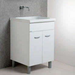 Composizione realizzata in nobilitato classe E1 da 18 mm bordato con colle poliuretaniche. Mobile porta lavatoio a due ante.