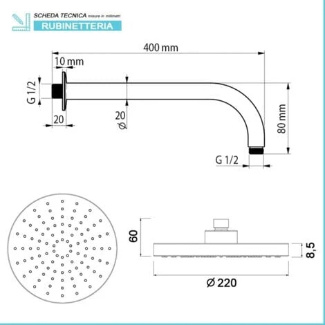 - Tipologia: braccio doccia tondo + soffione doccia tondo