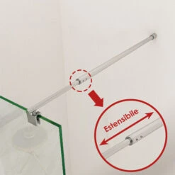 [Dimensione della barra di regolazione] 120 cm [Materiali] Finitura cromata lucida, acciaio inossidabile, lunga durata [Applicabilità] Compatibile con spessori di vetro da 5 a 10 mm [Accorciabile individualmente] Allungabile da 700 a 1200 mm [Installazione] Facilità di montaggio, possibilità di montaggio a diverse angolazioni rispetto alla parete (accessorio di fissaggio incluso)