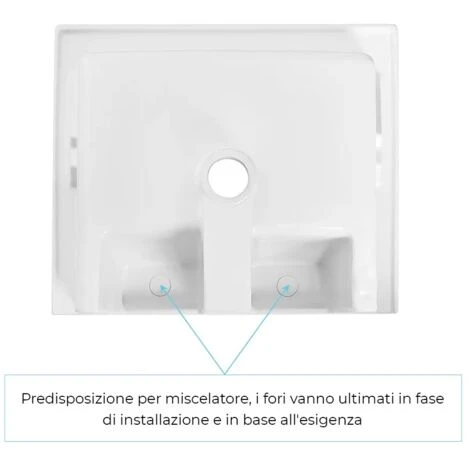 - Foro miscelatore: non presente, predisposizione per rubinetteria a muro o miscelatore monoforo a destra o sinistra